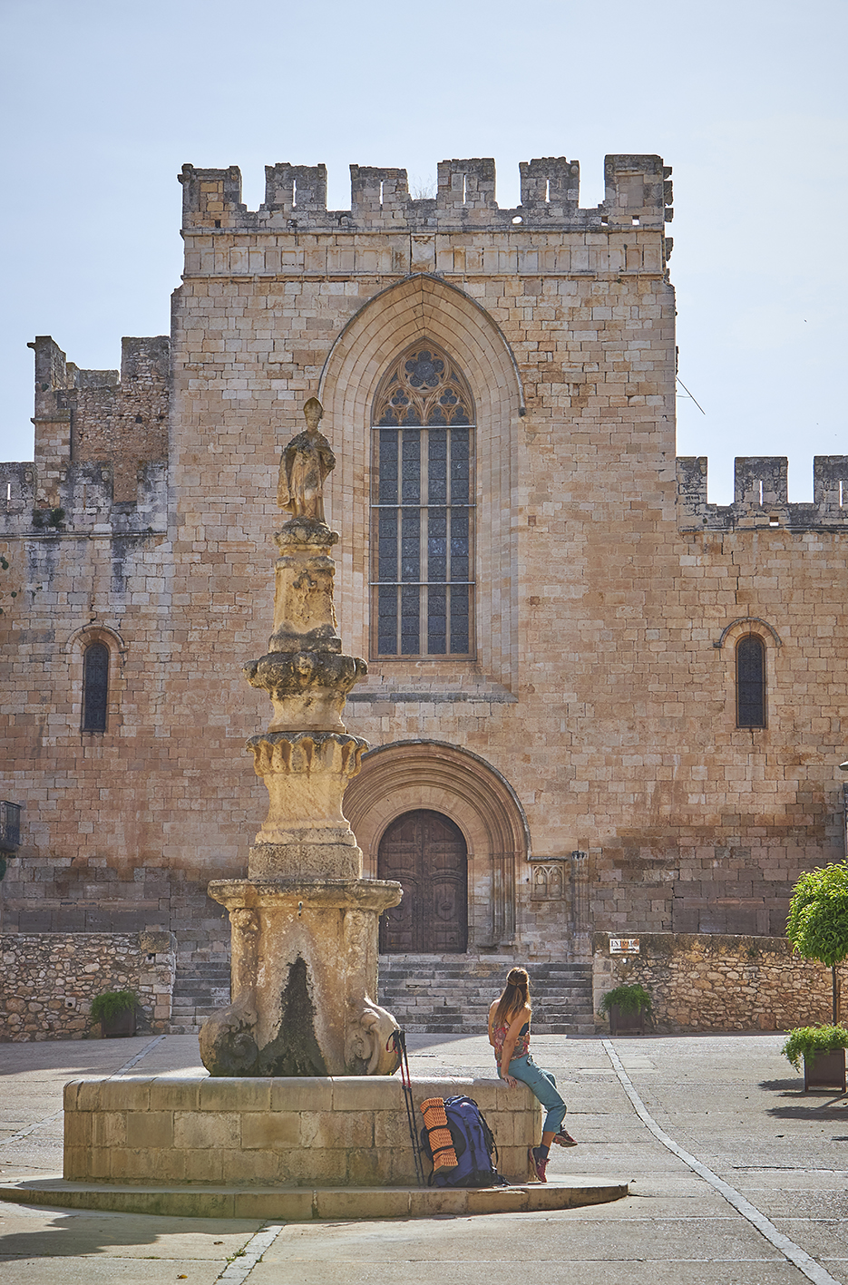 Entrem a Santes Creus pel carrer de la Ferreria que ens porta a la plaça barroca de Sant Bernat, amb les parets esgrafiades amb la font de Sant Bernat i l’escalinata de l’església del monestir al fons, és d’una gran majestuositat.