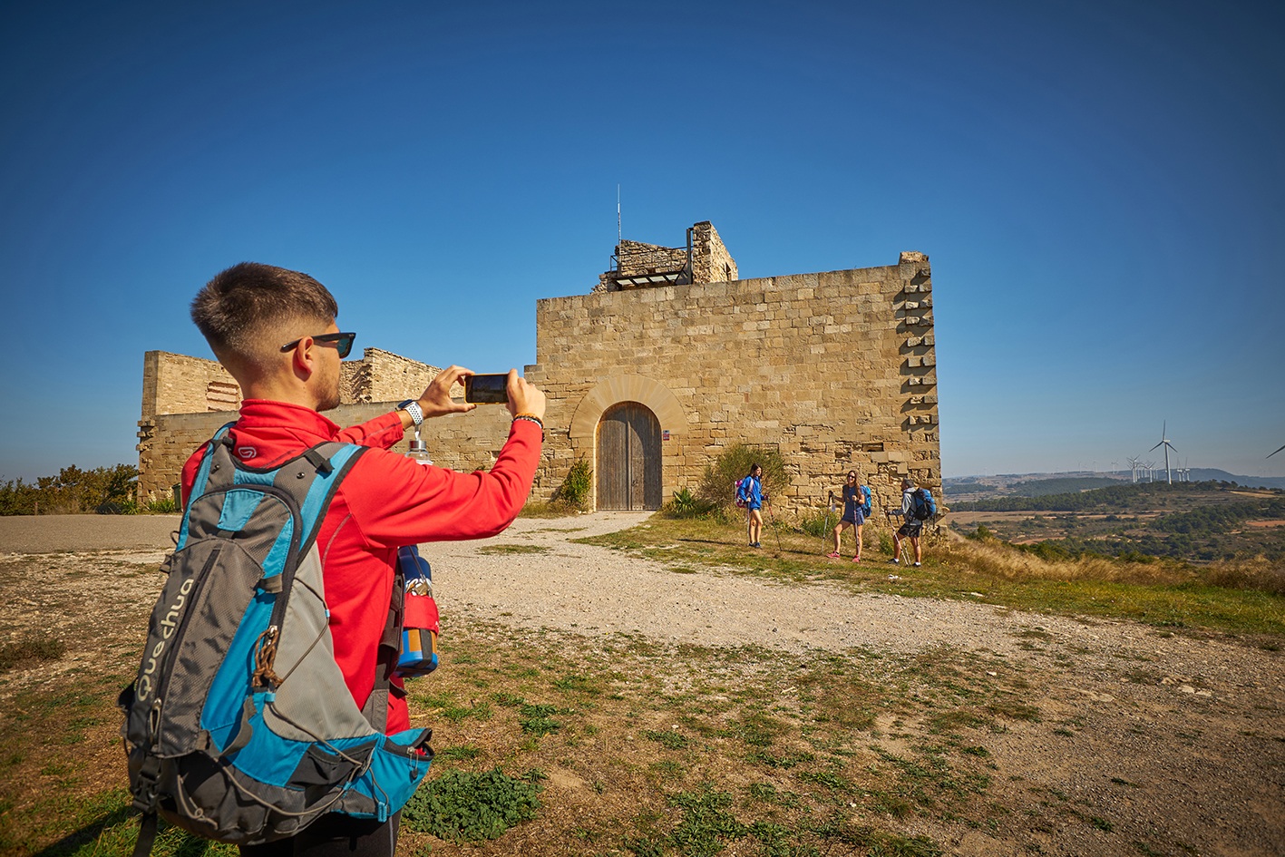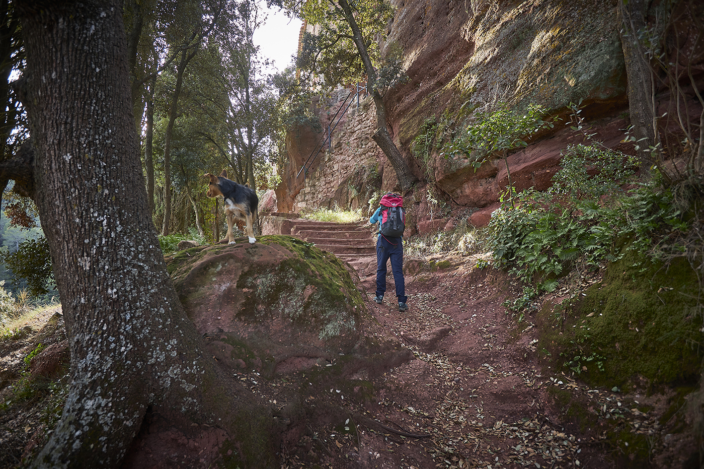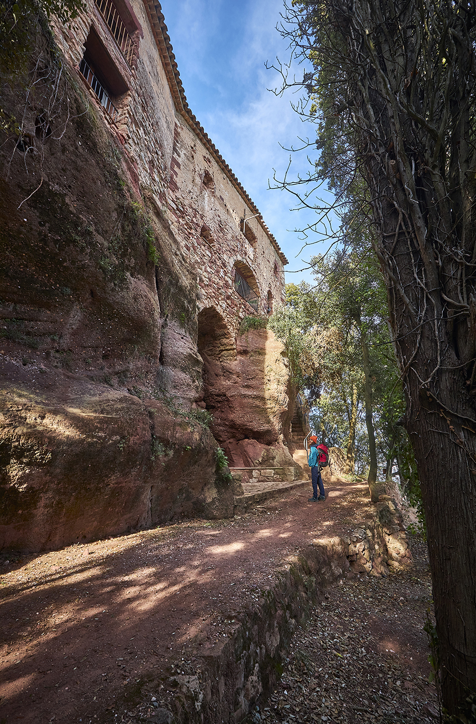 28,76 km (691 m). Ermita de Sant Joan de la Muntanya. Dins l’ermita hi trobem un punt de segellat del carnet 6T. Després de visitar l’ermita, continuem el nostre recorregut i baixem fins a l’encreuament. Unes escales esculpides a la roca roja ens portaran a un petit corriol. El camí baixa, puja i torna a davallar per fer cap a una pista. Continuem per la pista a l’esquerra.