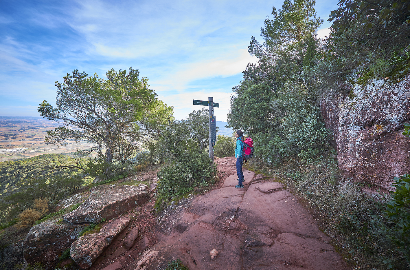 30,20 km. Cruïlla, sota el cim del Cogulló (881 m). Agafem el camí que surt a l’esquerra i pugem al cim, a 250m, i continuem pel senderó fins al mirador de la Roca del Cogulló, a uns 150 m, o bé, baixem a la pista i seguim les indicacions.