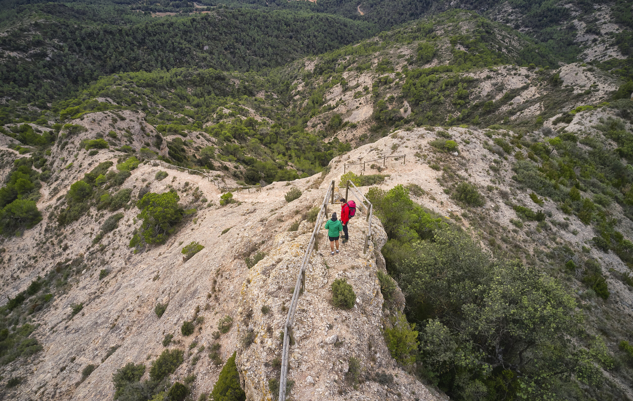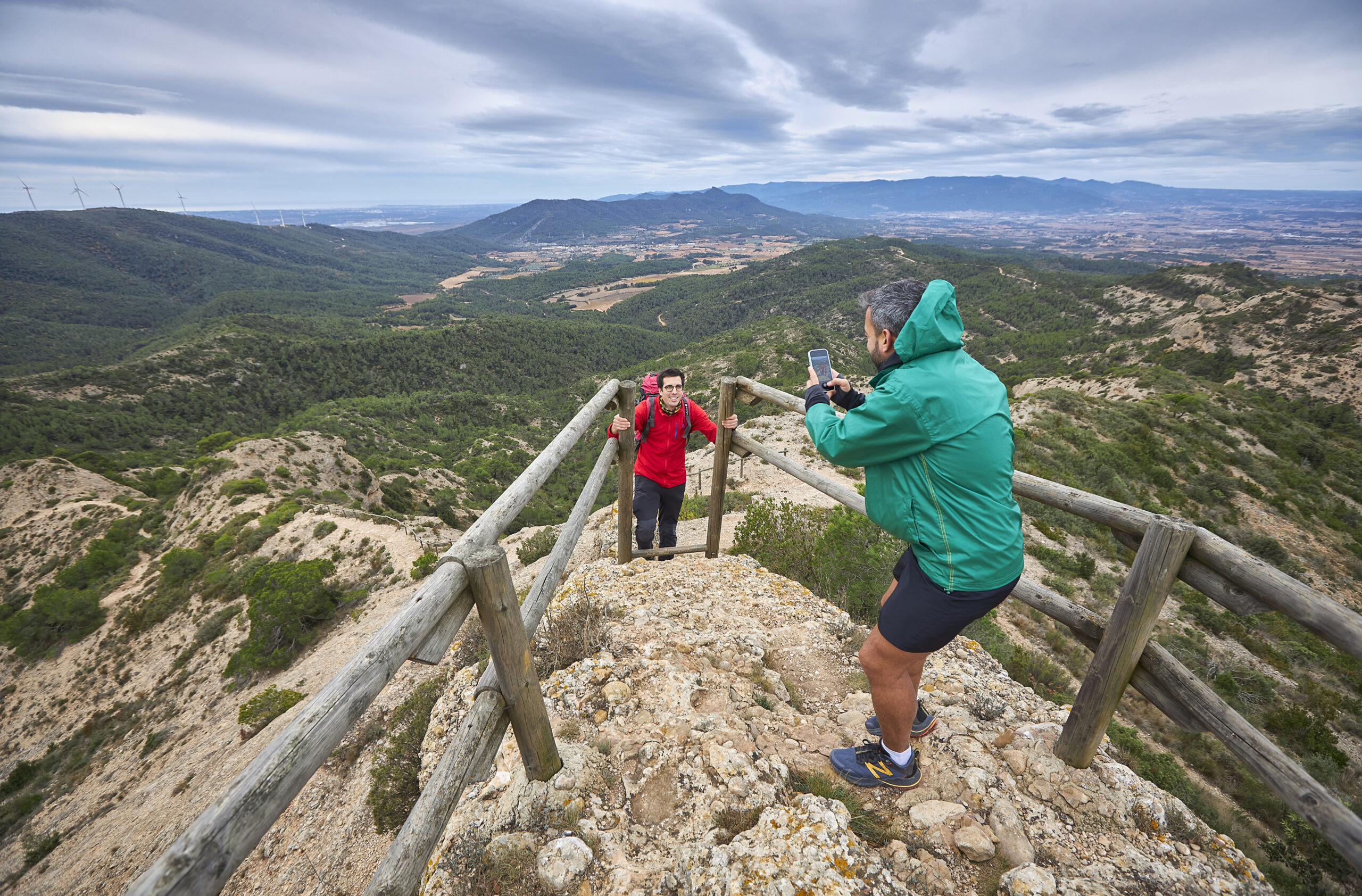 13,16 km. Bifurcació. Deixem la pista i prenem el camí que surt a l’esquerra i puja pronunciadament a la carena fent ziga-zagues i amb trams erosionats. Sortim a una pista que discorre a mitja alçada de la serra. Girem a l’esquerra i passem pel costat del mirador d’en Jordà, un punt d’observació amb molt bona vista sobre l’Alt Camp i que disposa de plafons d’informació de l’entorn (km 13,60, 697 m). Som dins de l’Espai Natural del Tossal Gros de la serra de Miramar.