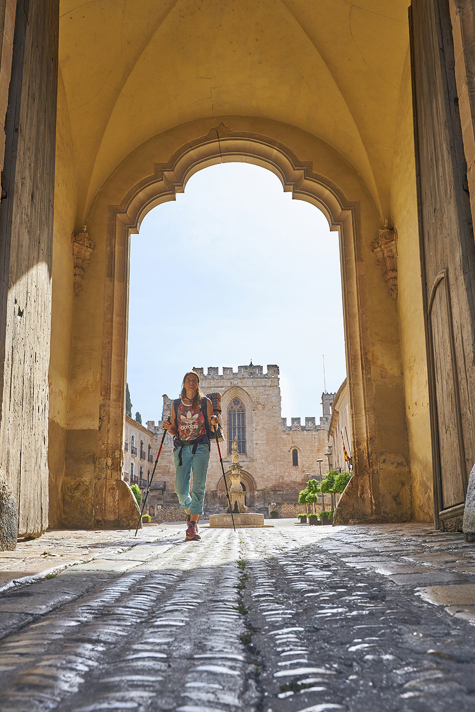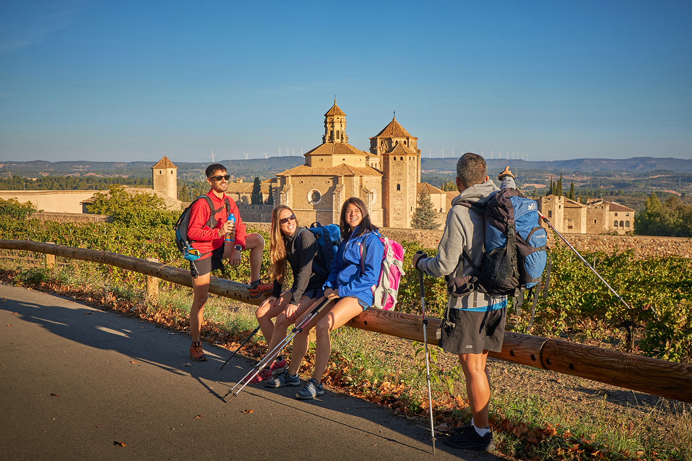 35 km. Plaça d’entrada al recinte del monestir de Poblet. Es recomana la visita al monestir, assistir a les vespres (pregàries cantades) i fer un tast de vins i productes locals a l’agrobotiga Fet a la Conca. El punt de segellat del carnet 6T es troba sota el portal de la terrassa del bar de l’Hostatgeria de Poblet.