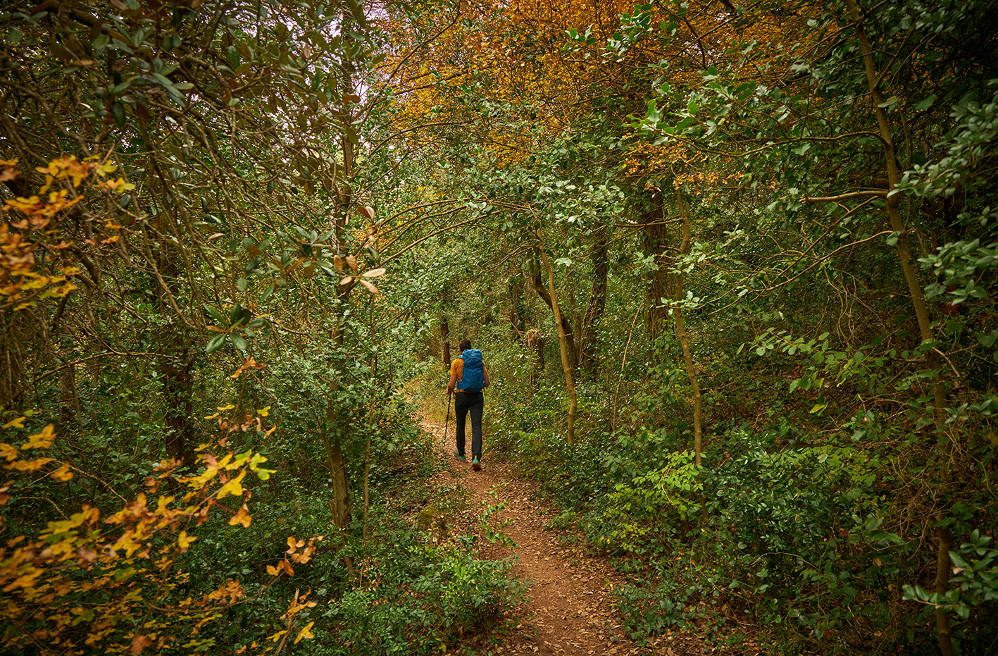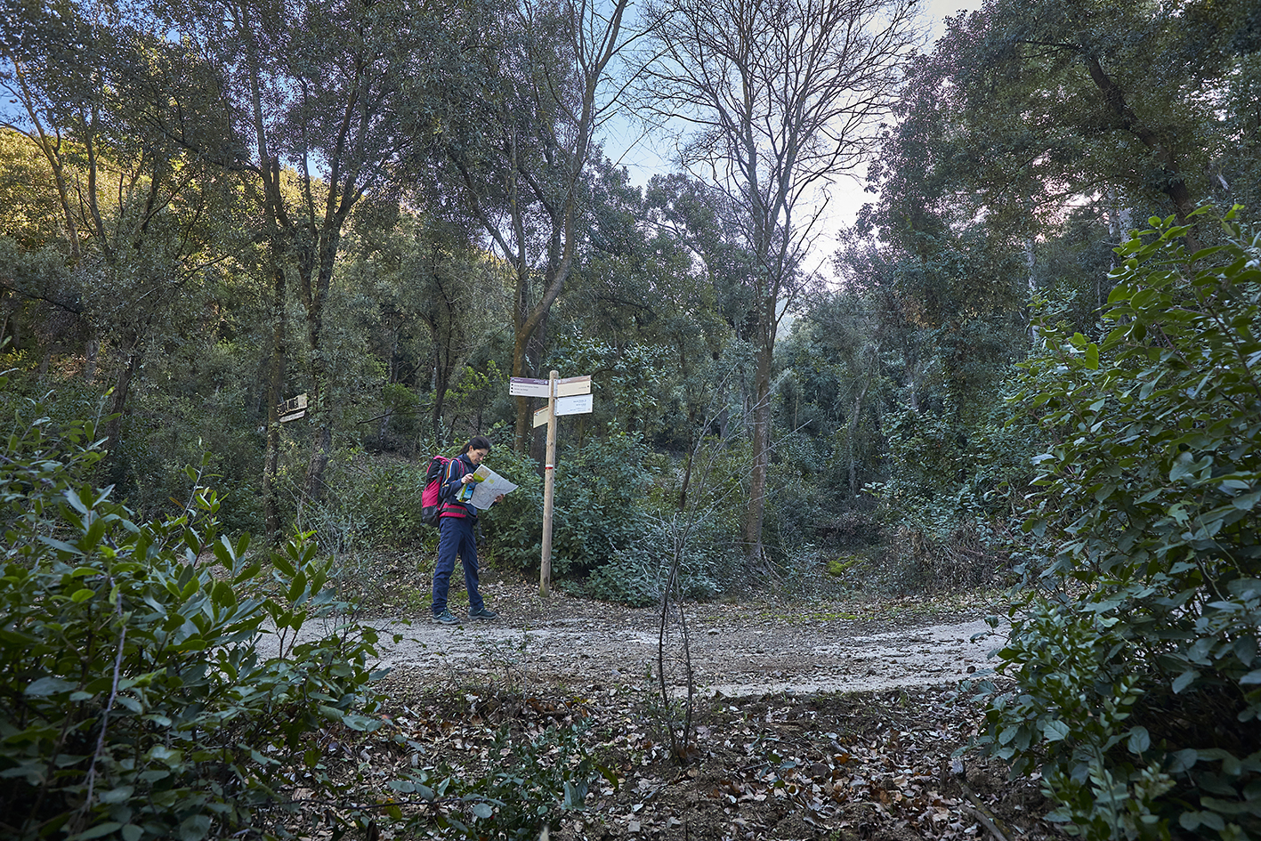 15,09 km. Cruïlla. Deixem la pista ampla que baixa cap a la font del Bou i per on se’n va la variant 1 en BTT. Continuem a l’esquerra pel senderó que transcorre enmig d’un bosc espès, el Bosc del Rector, que puja a un collet situat prop del tossal Gros.