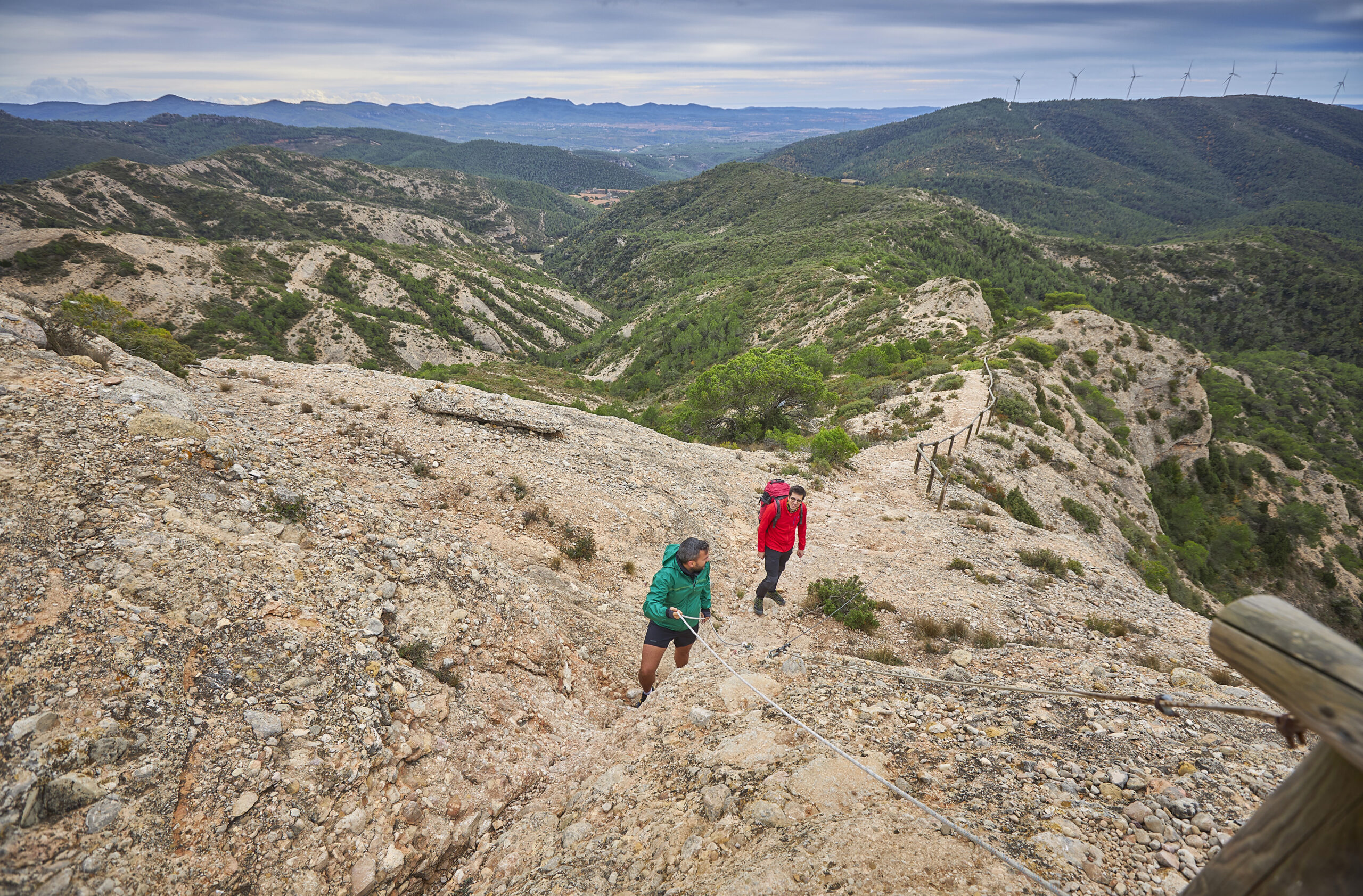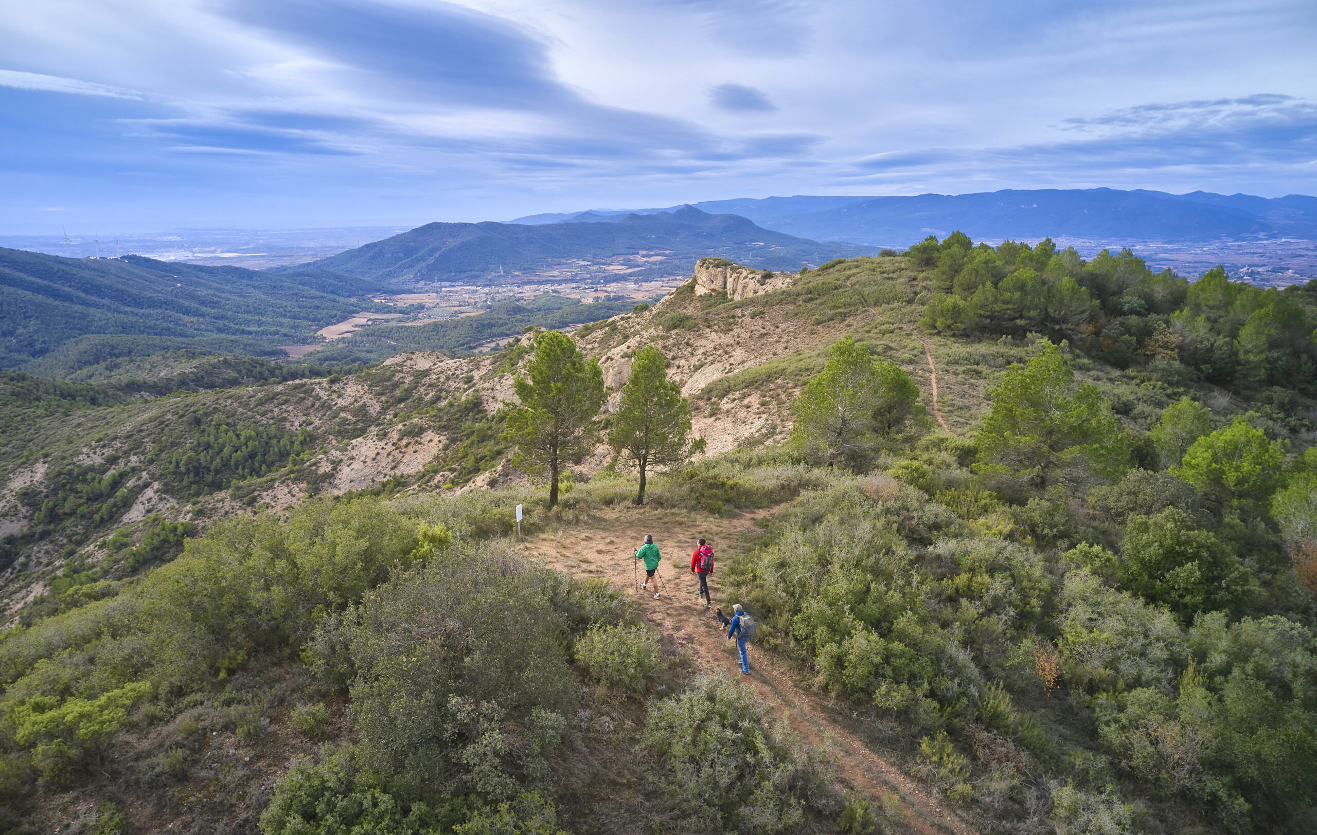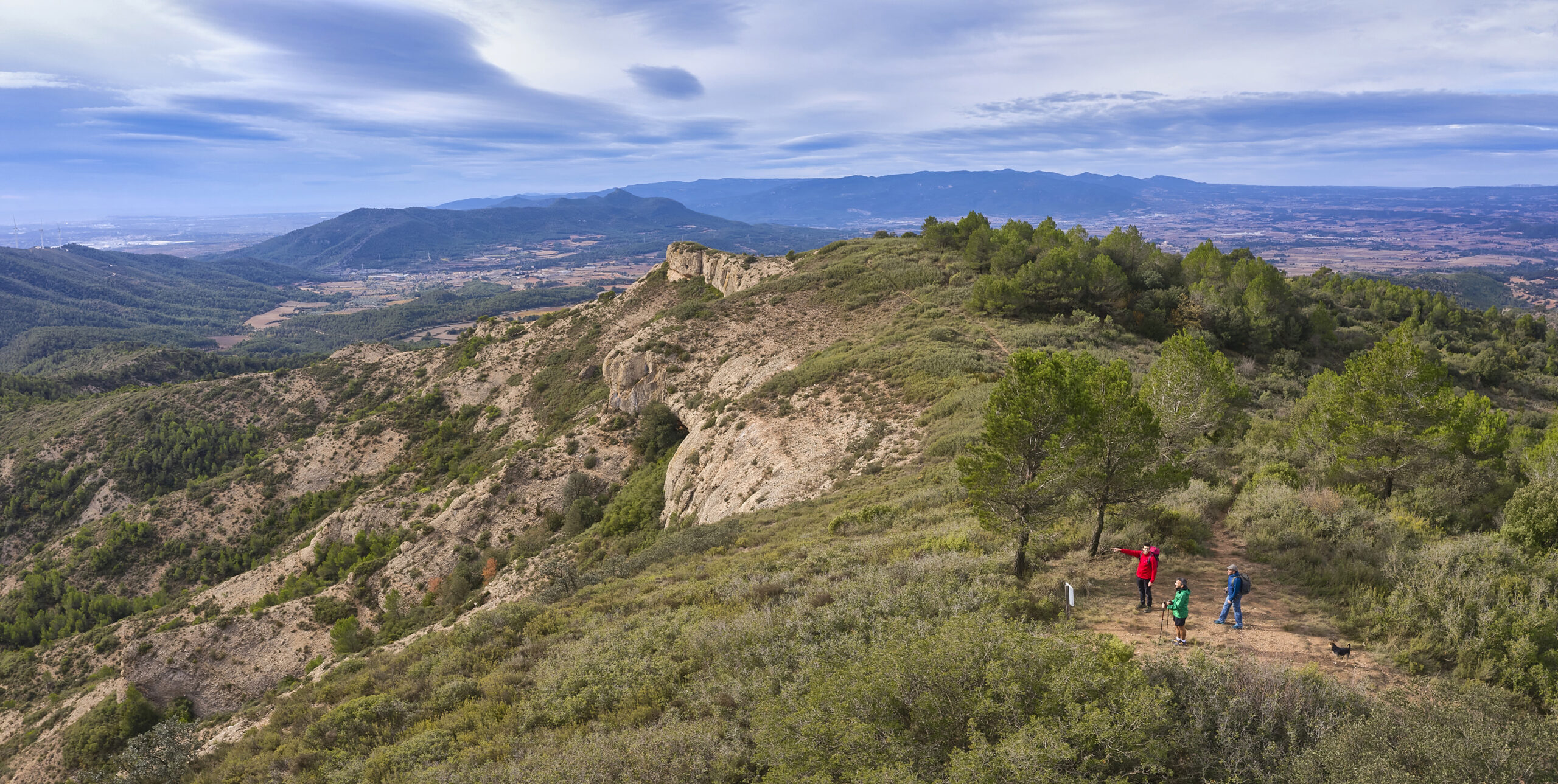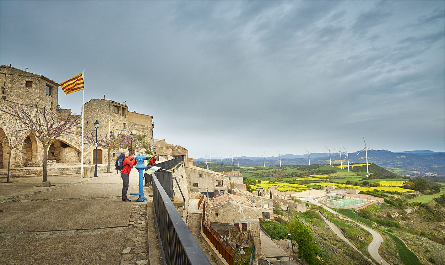 14,50 km (725 m). Mirador i punt de descans, Cap del Coll. Ens situem a la carena de la serra del Tallat, on es retroba l’itinerari en bicicleta. Travessem la carretera TV-2338 i continuem per l’ampla pista que surt a la dreta i que ressegueix el vessant meridional de la serra del Tallat, vorejant un parc d’aerogeneradors.