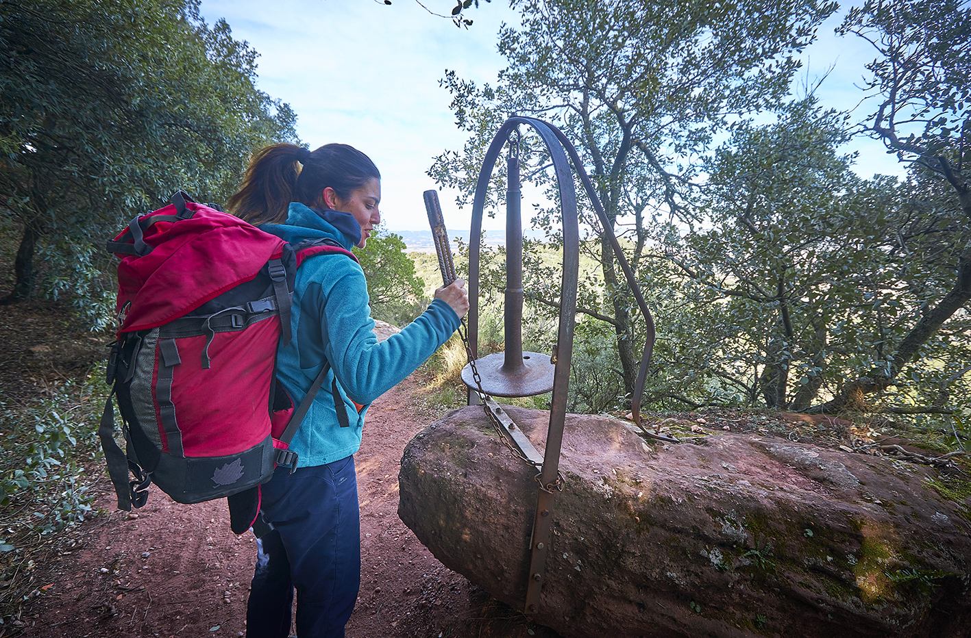 1,85 km. Cruïlla, bosc de Gorrines. Continuem pel bosc de Gorrines i deixem a l’esquerra el camí del Targa. Pugem per un corriol que s’enfila dret amunt. Arribem al trencall d’accés a l’ermita de Sant Joan. Per anar a l’ermita agafem el corriol a l’esquerra. Passem per la campana que destaca pel seu so característic.
