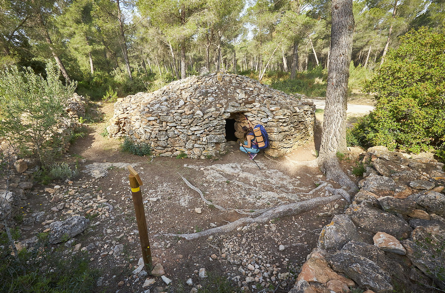 3,40 km. Barraca de ca l’Auger. Magnífica construcció destinada a les feines del camp realitzada amb pedra seca que forma part de la Ruta de la Capona del Pla de Santa Maria.. Seguim les traces del GR 175.