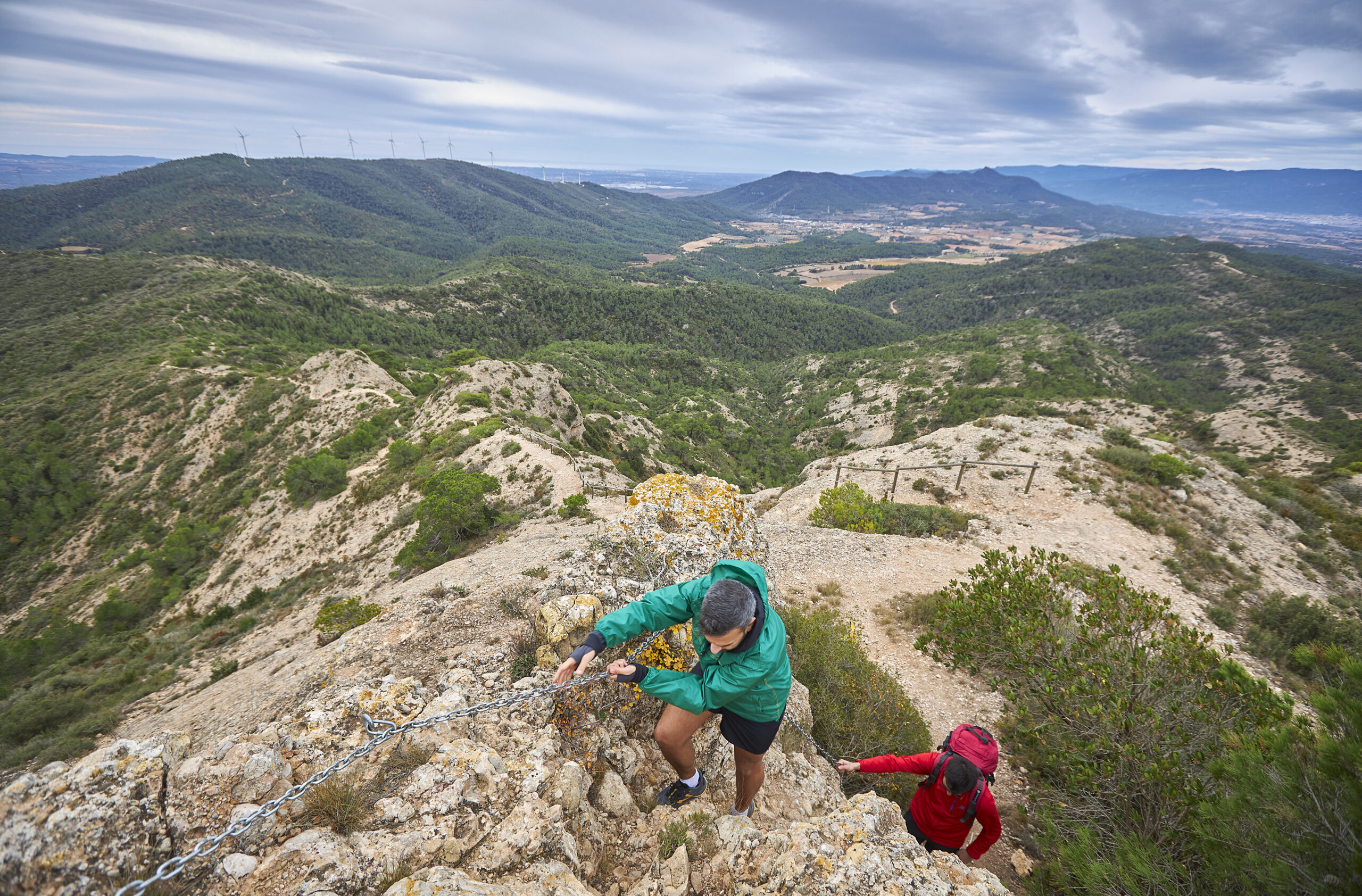 13,16 km. Bifurcació. Deixem la pista i prenem el camí que surt a l’esquerra i puja pronunciadament a la carena fent ziga-zagues i amb trams erosionats. Sortim a una pista que discorre a mitja alçada de la serra. Girem a l’esquerra i passem pel costat del mirador d’en Jordà, un punt d’observació amb molt bona vista sobre l’Alt Camp i que disposa de plafons d’informació de l’entorn (km 13,60, 697 m). Som dins de l’Espai Natural del Tossal Gros de la serra de Miramar.