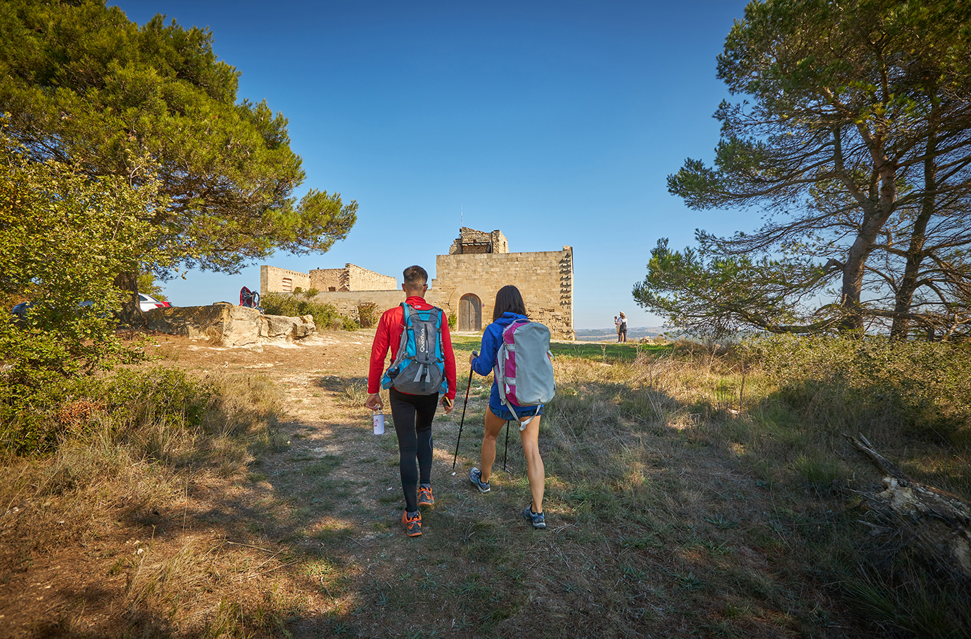 6,15 km. Cruïlla. Arribem a la pista de l’ermita de la Santíssima Trinitat (a 100 m a la dreta). L’ermita esta oberta tots els diumenges de 10h a 19h (aprox) per a usuaris i orants, dinars i festes, caminants i pelegrins des de Setmana Santa fins novembre. Servei d’acollida al visitant, records i begudes, amb opció de lloguer de taules i fogons per pícnic. (Reserves al +34 616 799 913). Continuem recte i pugem per remuntar un coll. Entrem dins de l’espai protegit del Paratge Natural de Poblet.