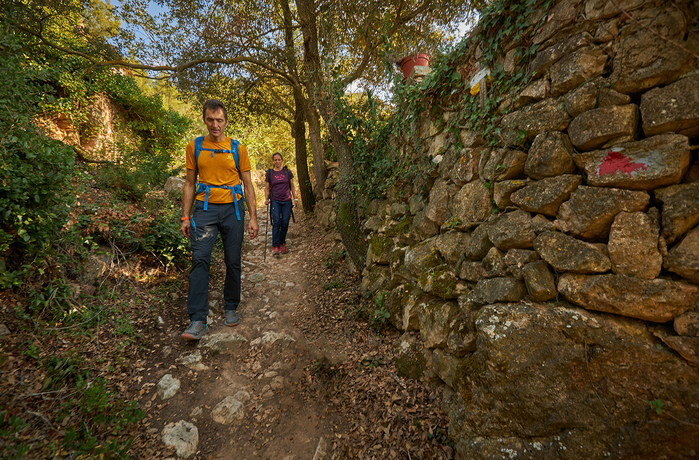 16,14 km. Font de Sant Salvador. En aquest punt, surt un corriol costerut que ens porta directament fins a l’antic castell de Prenafeta. El camí s’enfila per un terreny abrupte i exposat que convida a caminar amb molta atenció. Del castell, la resta més impressionant és un mur malmès. Costa d’entendre com encara es manté dret, colpejat sense pel vent i les tempestes. Al voltant, es poden veure altres panys de mur més baixos, un cos d’edifici encaixonat dins l’espai estret i allargassat de la cresta.