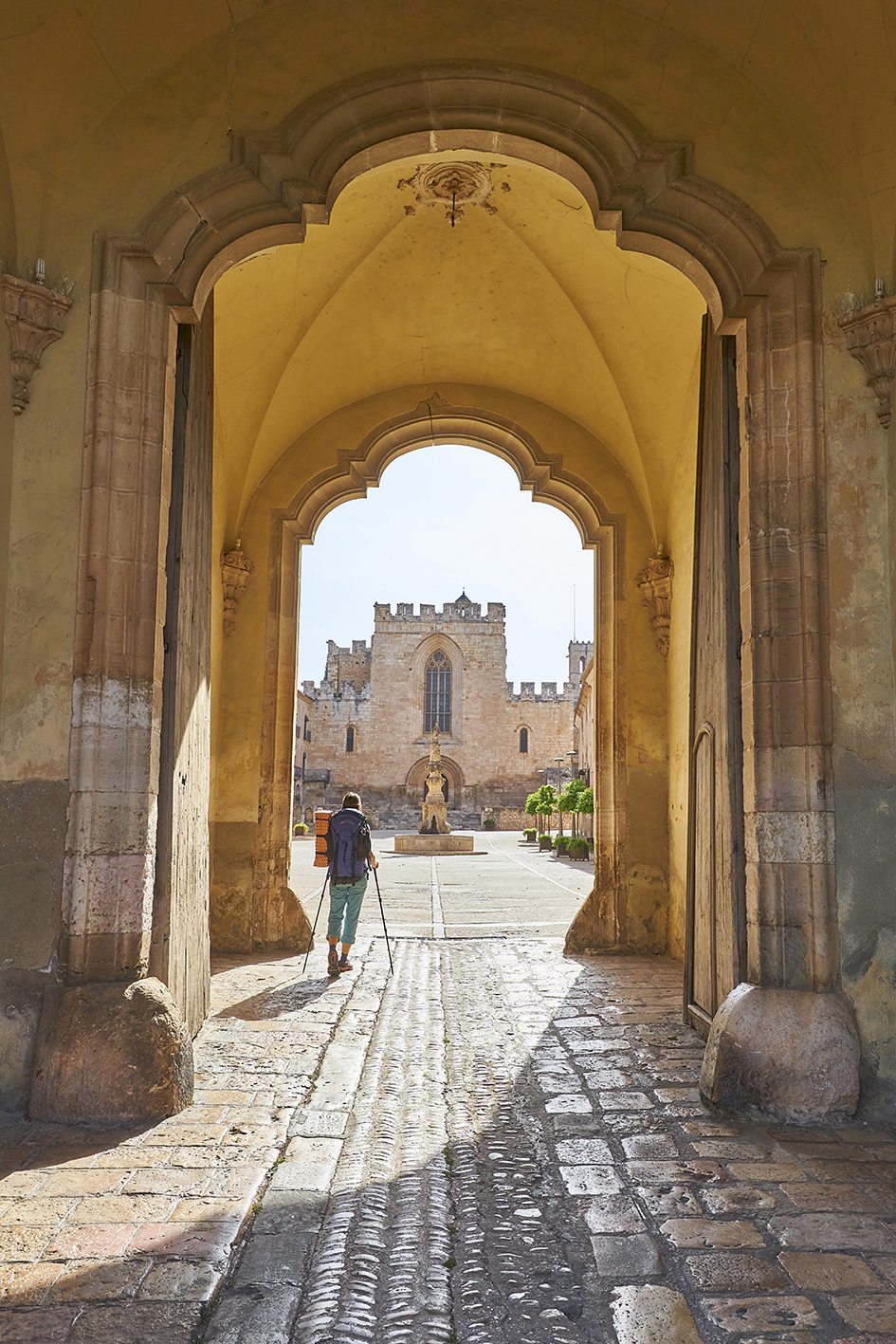 35 km. Plaça d’entrada al recinte del monestir de Poblet. Es recomana la visita al monestir, assistir a les vespres (pregàries cantades) i fer un tast de vins i productes locals a l’agrobotiga Fet a la Conca. El punt de segellat del carnet 6T es troba sota el portal de la terrassa del bar de l’Hostatgeria de Poblet.