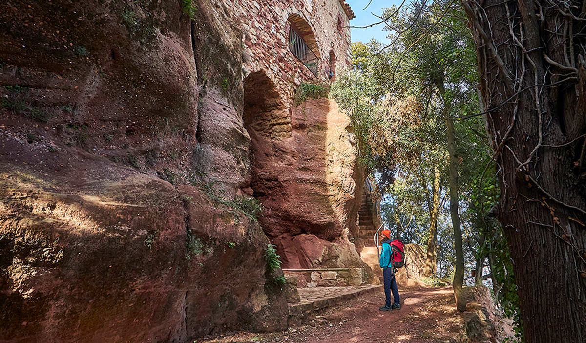 28,76 km (691 m). Ermita de Sant Joan de la Muntanya. Dins l’ermita hi trobem un punt de segellat del carnet 6T. Després de visitar l’ermita, continuem el nostre recorregut i baixem fins a l’encreuament. Unes escales esculpides a la roca roja ens portaran a un petit corriol. El camí baixa, puja i torna a davallar per fer cap a una pista. Continuem per la pista a l’esquerra.